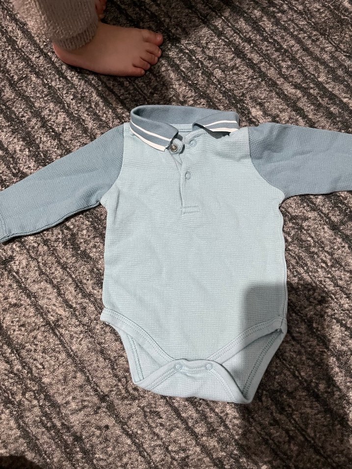 Gri renkte, uzun kollu, düğmeli ve yakalı bebek body. Yumuşak ve rahat kumaştan, sokak stili için uygun.