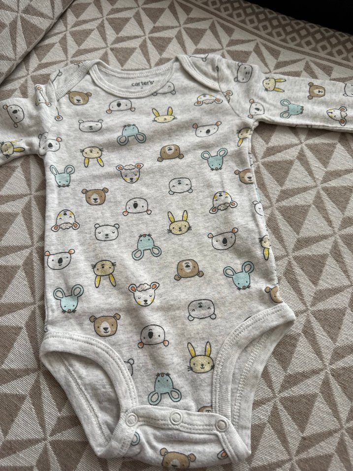 Uzun kollu, düğmeli, pamuklu gri bebek body. Sevimli hayvan desenleriyle rahat kullanım sağlar.