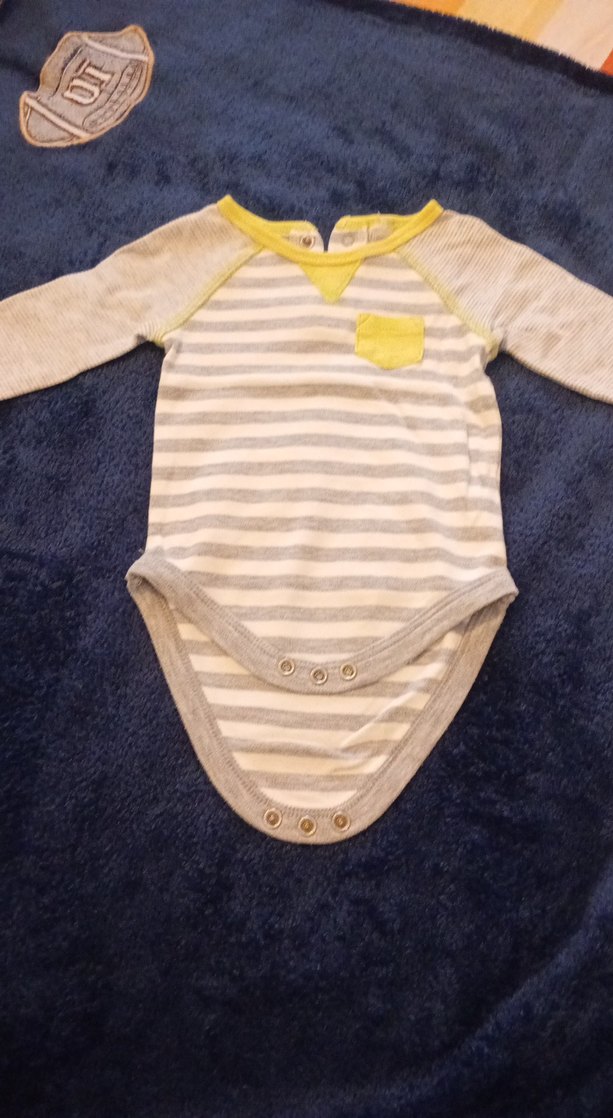 Uzun kollu, gri renkte bebek body. Düğmeli ve küçük sarı cep detayı bulunur. Yumuşak ve sıcak kumaştan üretilmiştir.
