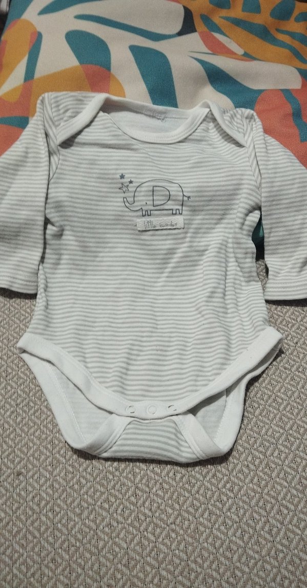 Yumuşak pamuktan, düğmeli, uzun kollu gri bebek body. Önünde küçük fil baskısı bulunur.