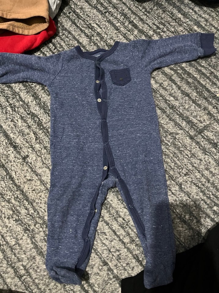 Uzun kollu, düğmeli ve yumuşak, sıcak kumaştan üretilmiş gri bebek tulumu. Notlu yakası ve sade normcore tarzı bulunur.