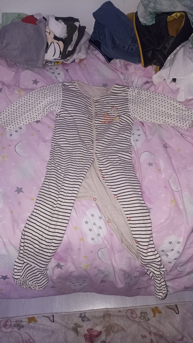 Uzun kollu, V yakalı ve düğmeli gri bebek tulumu, çizgili ve puantiyeli desene sahiptir. Rahat kullanım için uygundur.