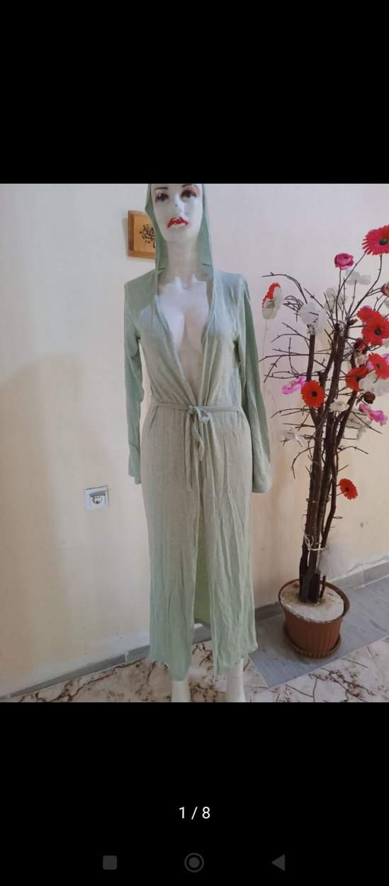 Uzun kollu, bol kesim, pastel gri renkte bohem tarzda kapüşonlu ve kuşaklı kadın sabahlığı. Yumuşak ve rahat kumaştan üretilmiştir.