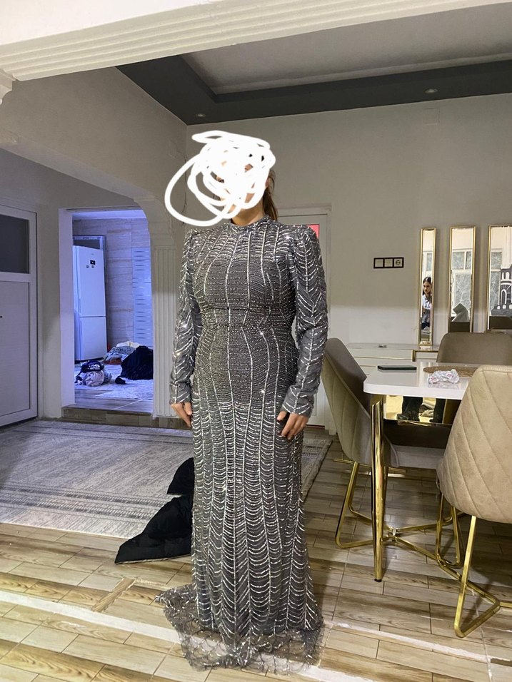 Uzun Kollu Gri Boncuk İşlemeli Elbisesidir 42 beden
