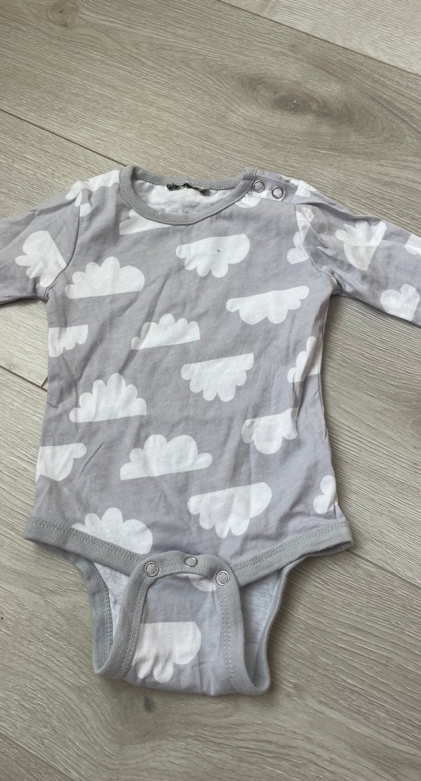 Uzun kollu, gri renkte bulut desenli bebek body. Yuvarlak yakalı ve kolay giyim için düğmeli. ☁️
