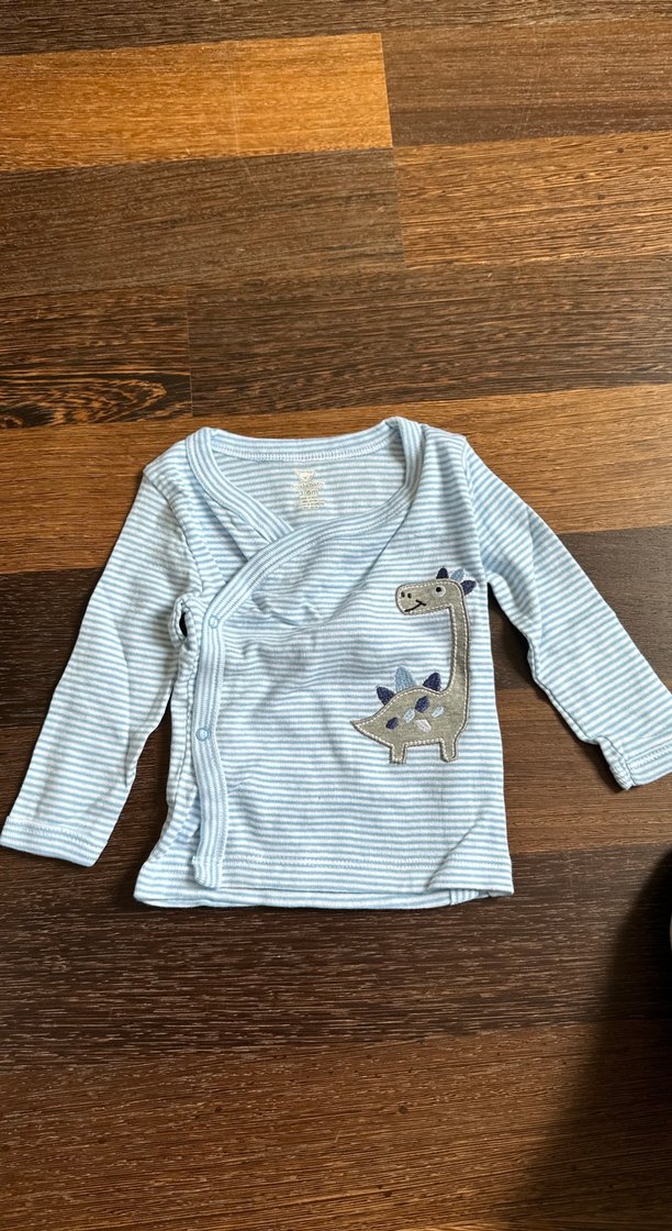 Uzun kollu, düğmeli V yakalı, gri çizgili ve dinozor desenli, yumuşak ve sıcak dokulu bebek badisi.