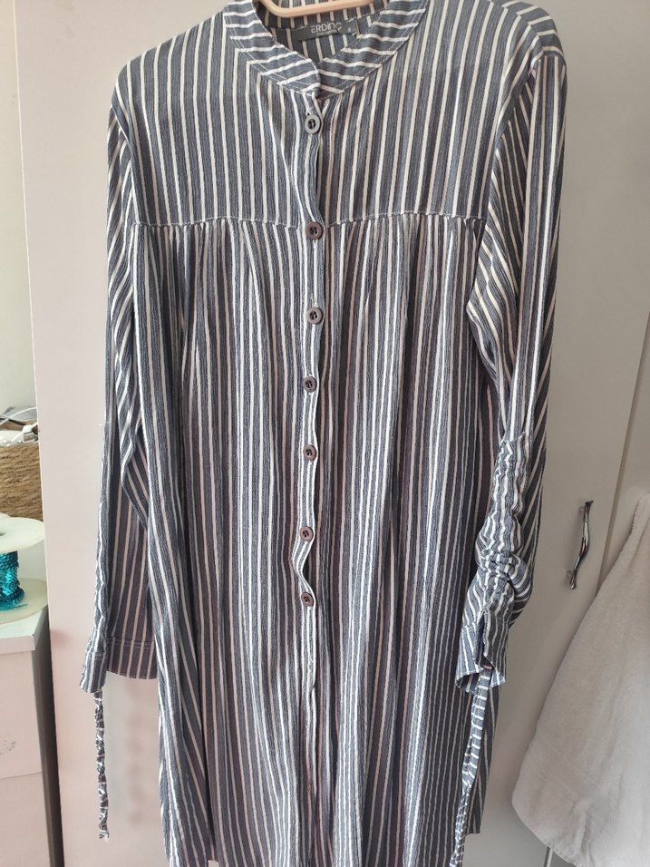 Gri tonlarda çizgili, uzun kollu, keten kumaştan yapılmış bol kesim gömlek. Düğmeli ve kayık yaka detayına sahip, günlük kullanıma uygundur.