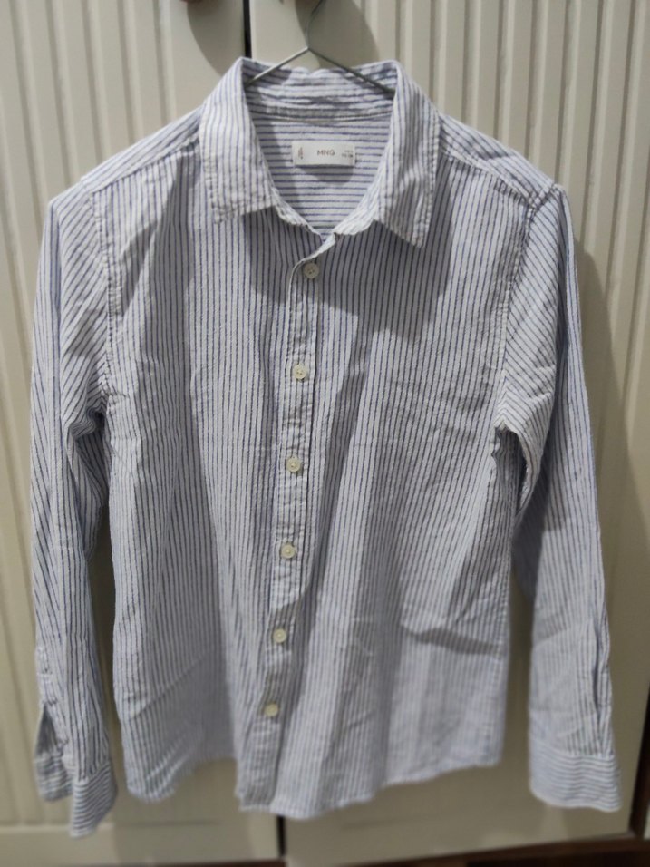 Uzun kollu, düğmeli, yakalı mavi cizgili kiz cocuk gömlek. Çizgili deseni ve normal kesimiyle günlük kullanıma uygundur.