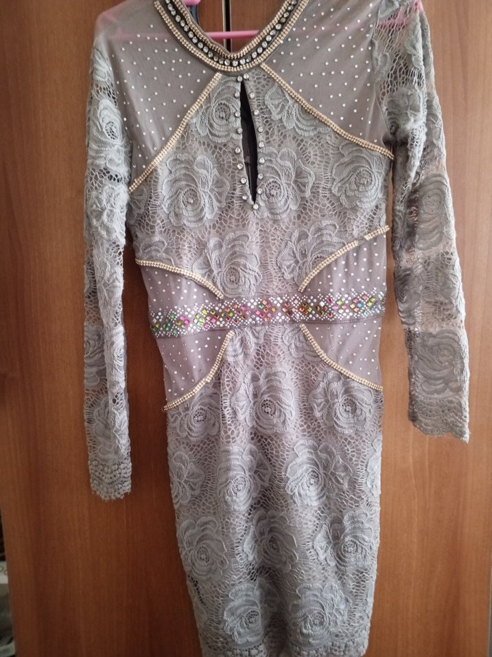 Uzun Kollu Gri Dantel İşlemeli Abiye Elbise