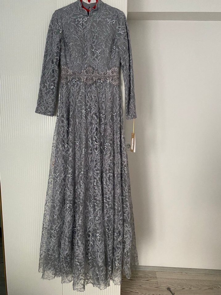Yüksek yakalı, uzun kollu, gevşek kesim gri dantel elbise. İnce yılan deseni ve vintage-modern klasik tarzı ile düğünler için uygun.
