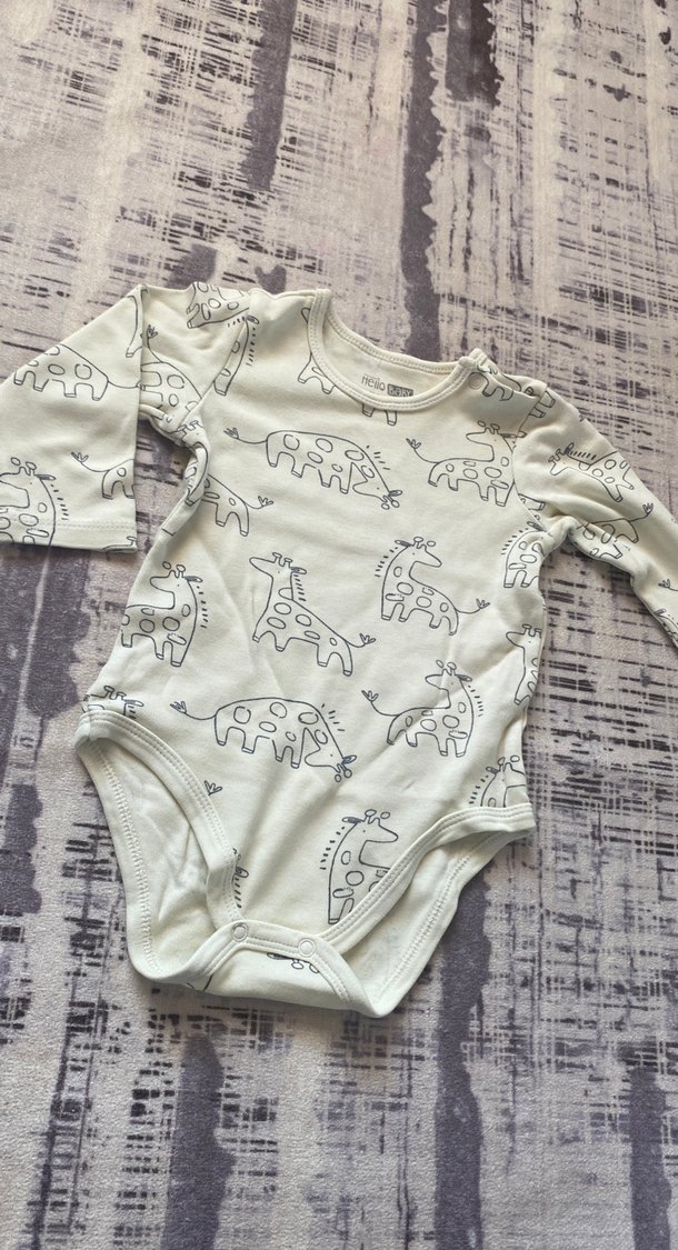 Uzun kollu, yuvarlak yakalı bebek body, beyaz pamuklu kumaş üzerine gri zürafa desenleri ile. Kolay giydirme için düğmeli.