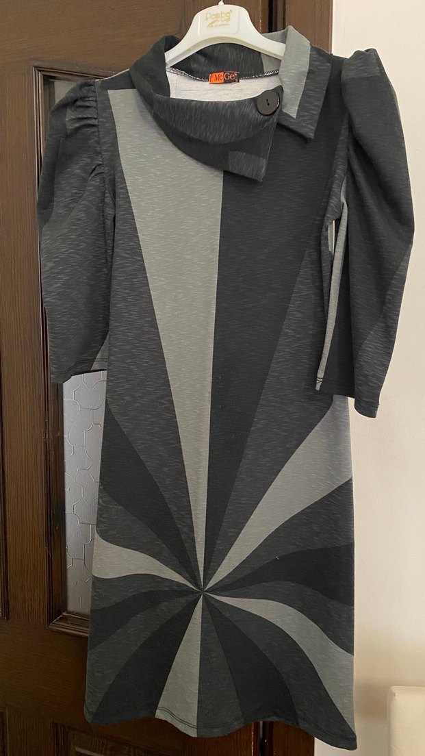 Yumuşak sentetik kumaştan üretilmiş, uzun kollu, yüksek yakalı ve drapeli, gri tonlarında desenli, fit kesim uzun triko elbise. Günlük kullanıma uygundur. Yeni ürün bikaç kere kullanıldı kaliteli kumaş