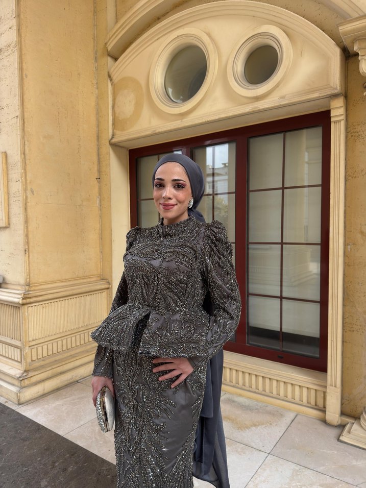 Yüksek yakalı, etnik desenli ve drape detaylı uzun kollu gri abiye elbise, düğünler için sade ve şık bir seçenektir. Abiyemiz 36 38 40 42 beden uyumludur arkası ipliklidir 3500 TL'dir müsaitlik durumunu sorunuz