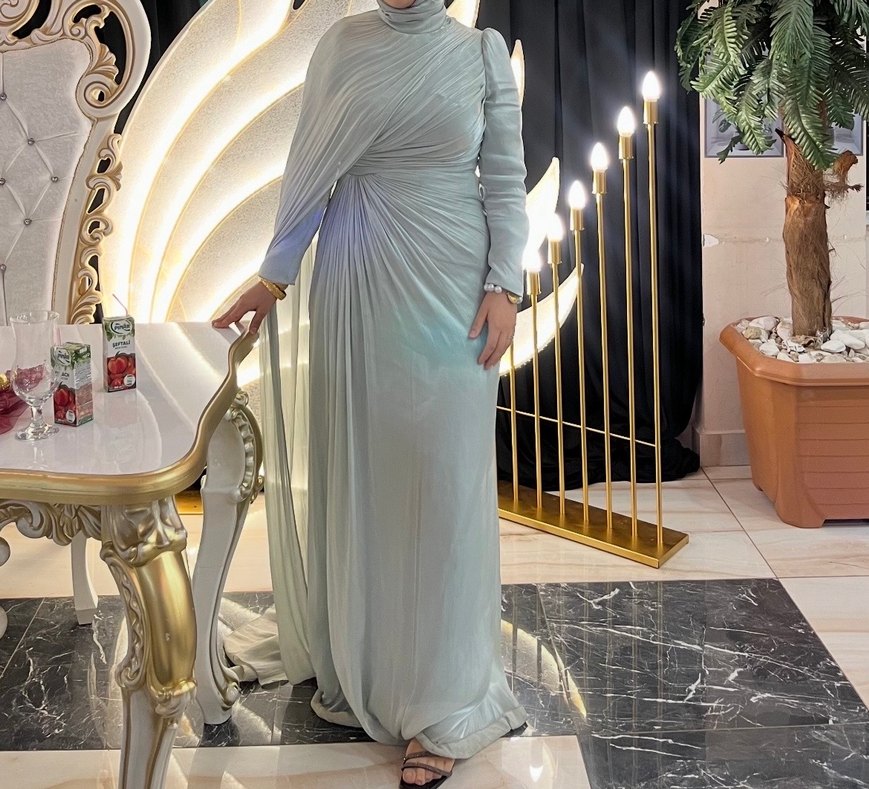 Yüksek yakalı, uzun kollu ve fit kesim gri uzun abiye elbise, şık drapelerle modern klasik ve gösterişli bir tarz sunar.