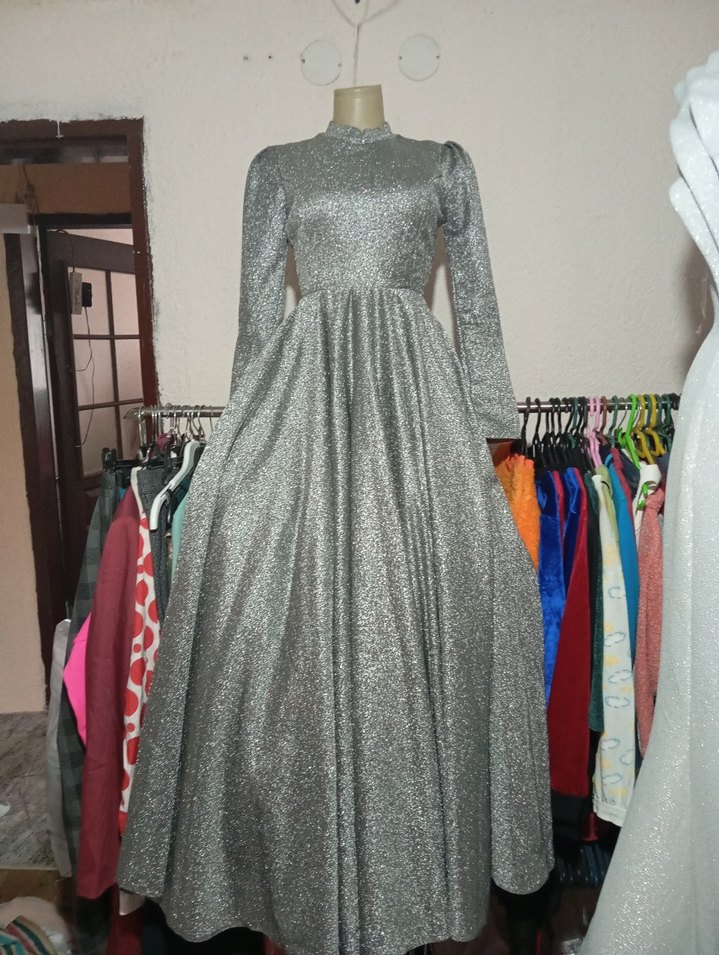 Uzun kollu, yüksek yakalı gri abiye elbise, drapeli ve klasik şıklıkta, düzenli kesim ile düğünler için uygundur. ✨