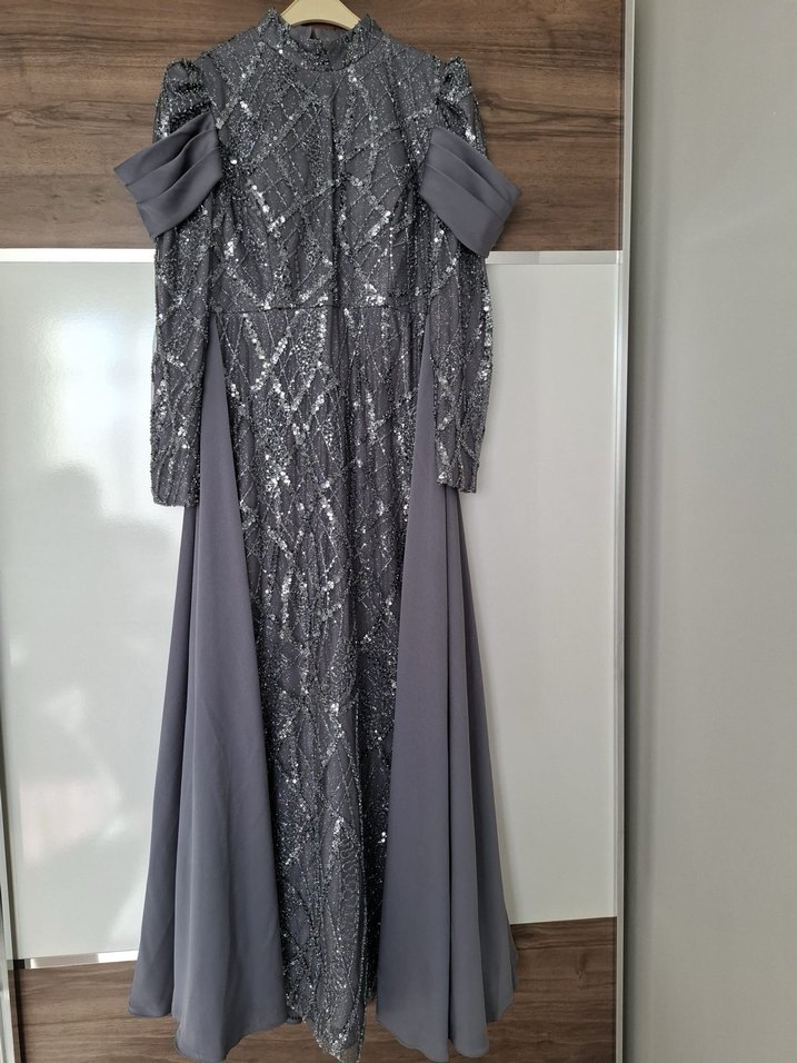 Yüksek yakalı ve uzun kollu, drapeli ve bol kesim gri uzun abiye elbise. Desenli ve modern klasik tarzda, düğün için uygun. ✨