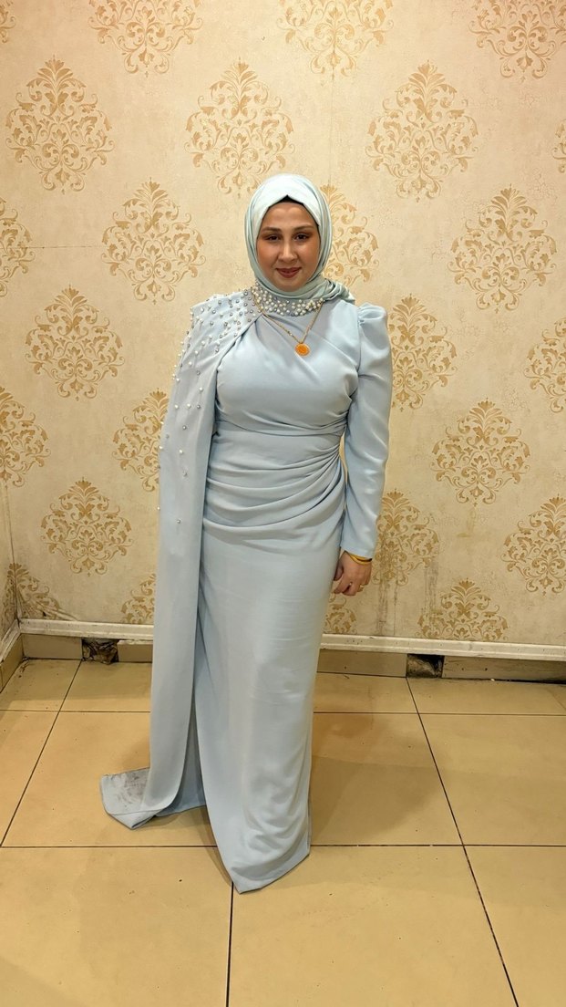 Uzun, açık gri renkte, yüksek yakalı ve uzun kollu abiye elbise. Drapeli tasarımı ve etnik desenleri ile mütevazı ve göz alıcı, düğünler için uygun.