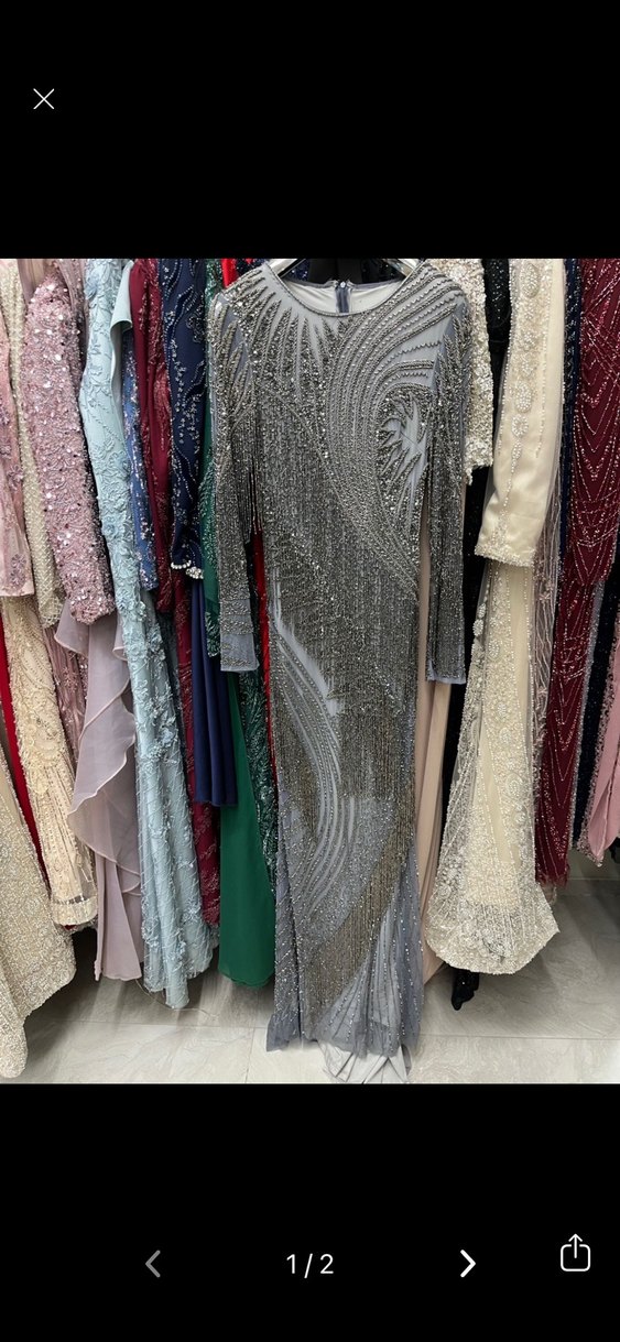 Uzun kollu, drapeli detaylara sahip gri abiye elbise. Tekne yaka ve vücuda oturan kesimiyle parti için bohem ve göz alıcı bir tarz sunar. ✨