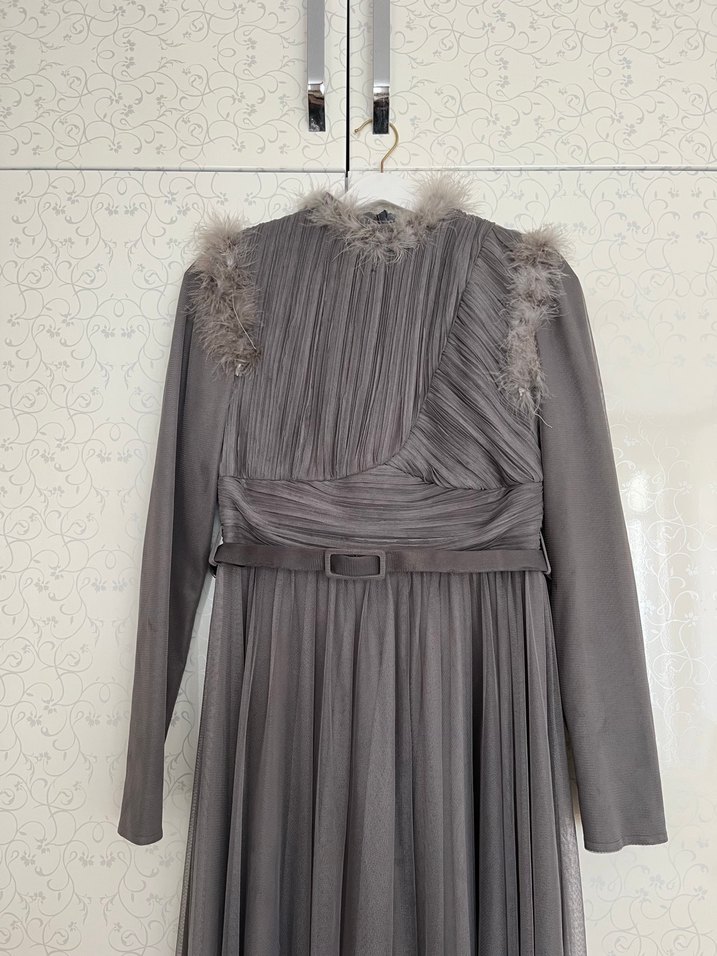 Drapeli ve tüylü detaylı, yüksek yakalı, uzun kollu, kemerli, klasik kesim gri abiye elbise. Uzun ve şık, düğünler için uygun. ️
