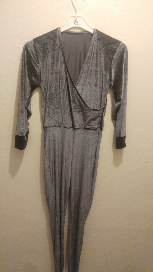 Uzun kollu, V yakalı ve drapeli tasarıma sahip gri renkli, kadife riklalı kumaştan yapılmış dar kesim kadife tulum pantolon günlük kullanım için uygundur.