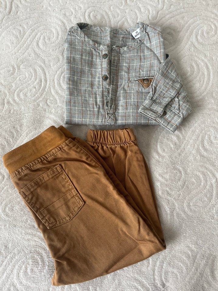 Gri ekoseli, uzun kollu ve düğmeli gömlek ile kahverengi pamuk pantolondan oluşan bebek erkek takımı. Rahat kesimiyle sokak stiline uygun. Gömlek 24 ay pantolon 12-18 ay fakat ikisini aynı zamanda giydirdim 2 yaşa uygundur