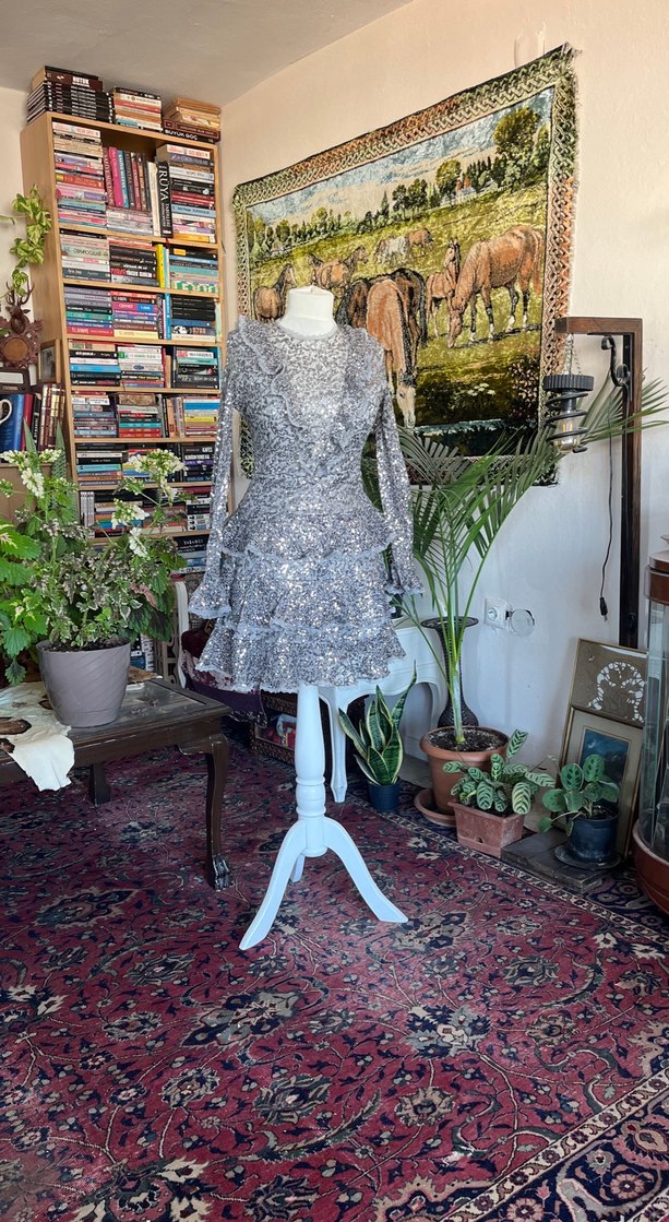 Yüksek yakalı, uzun kollu, pullu desenli ve fırfırlı detaylara sahip bu gri dar kesim elbise, gögüs kısmı transparan , romantik bir akşam için ideal. Elbise boy 79 cm