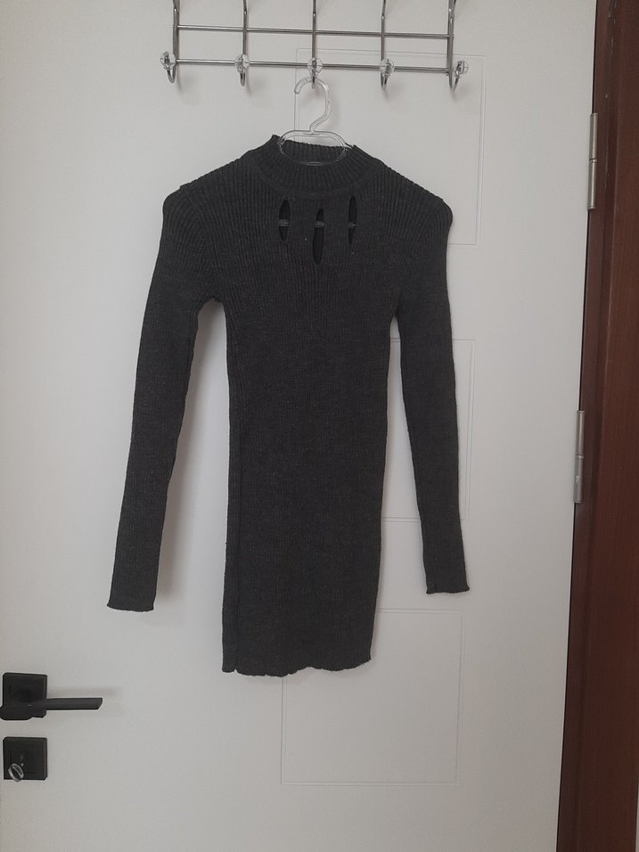 Yüksek yakalı, uzun kollu ve ince kesim gri triko elbise. Avant-garde tarzı, küçük kesik detaylarıyla dikkat çeker.