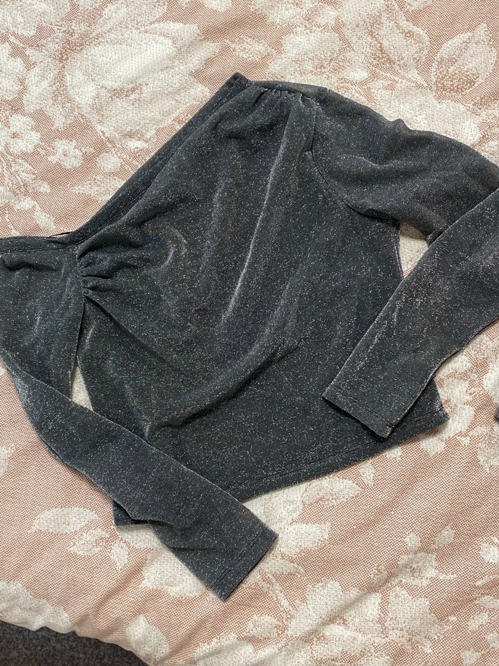 Bu dar kesim gri bluz uzun kollu, kayık yaka ve drapeli tasarıma sahiptir. Yumuşak sentetik kumaştan yapılmış, rahat ve midi boyda, romantik akşamlar için uygundur.