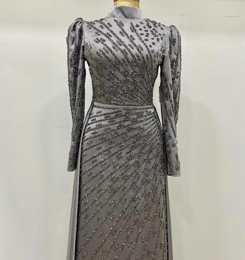 Uzun Kollu Gri İşlemeli Abiye Elbise