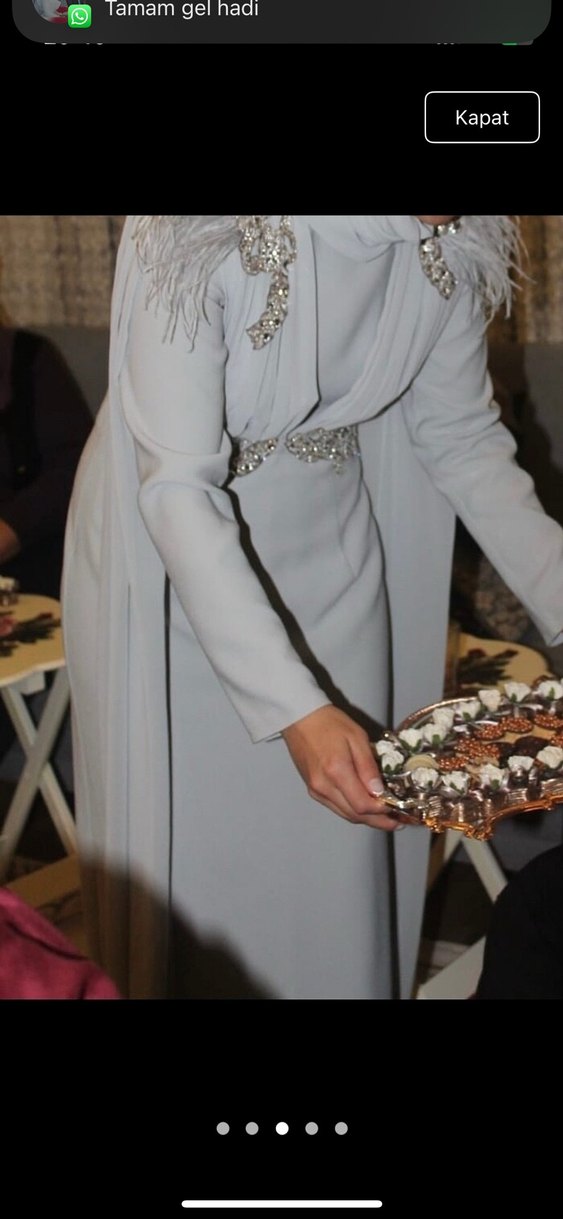 Uzun kollu, işlemeli ve drapeli detaylara sahip, klasik kesim gri abiye elbise. Modern klasik tarzda, şık ve zarif bir görünüm sunar.1 KERE İSTEMEDE GİYİLDİ HİÇ BİR KUSURU YOKTUR