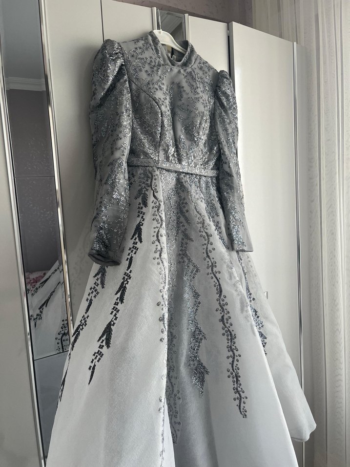 Uzun kollu, yüksek yakalı gri abiye elbise, işlemeli detaylar ve drapeli kesime sahiptir, düğünler için uygundur. ✨ 1 kere giyildi
