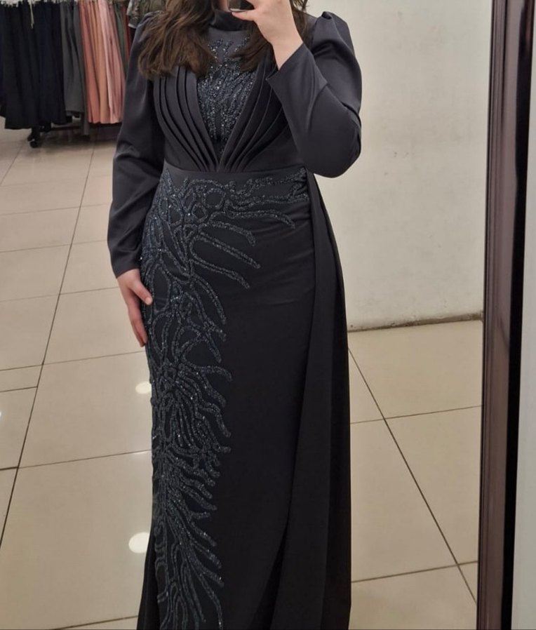 Yüksek yakalı, uzun kollu gri abiye elbise, drapeli detaylar ve işlemelerle süslenmiştir. Düğün için uygun, modern ve klasik şıklıkta. boy 1.68