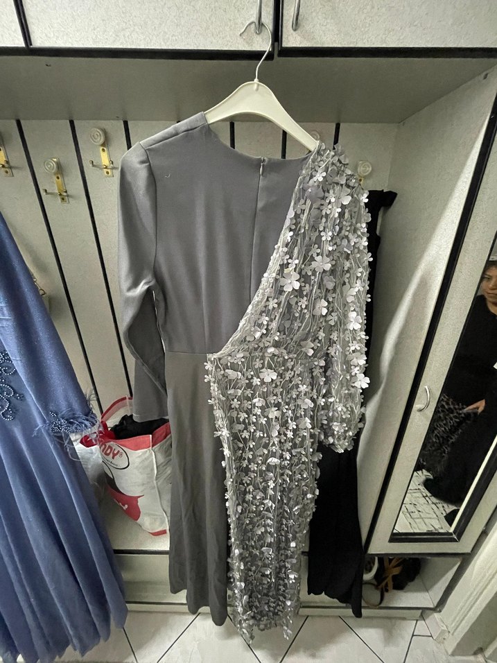 Uzun Kollu Gri İşlemeli Drapeli Abiye Elbise