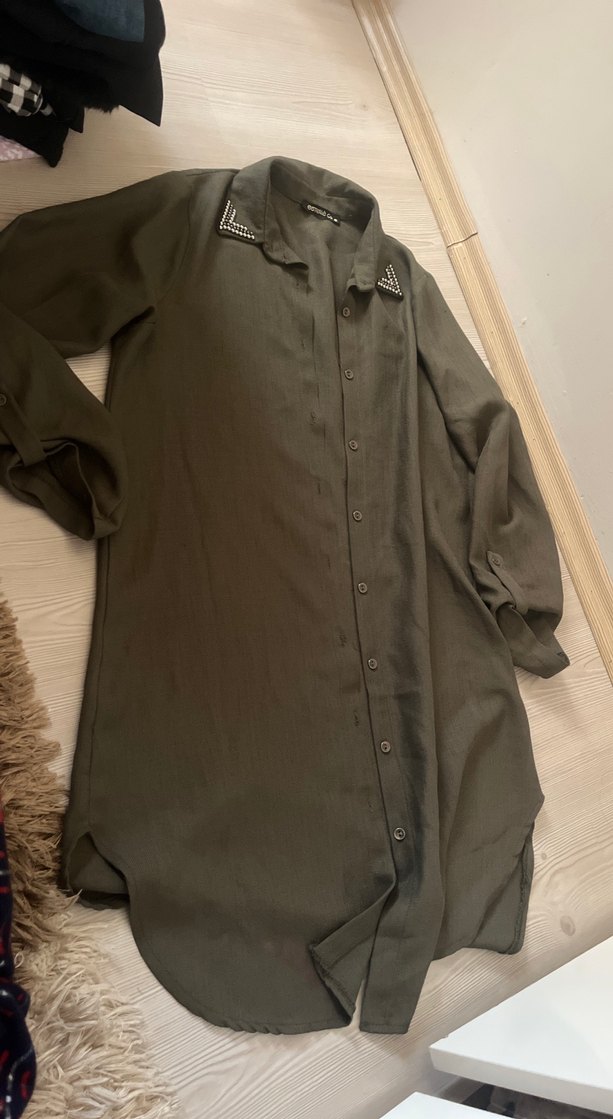 Gri renkte, keten kumaştan uzun kollu, düğmeli ve yakalı, bol kesim kadın gömlek. Günlük rahat kullanım için uygundur.