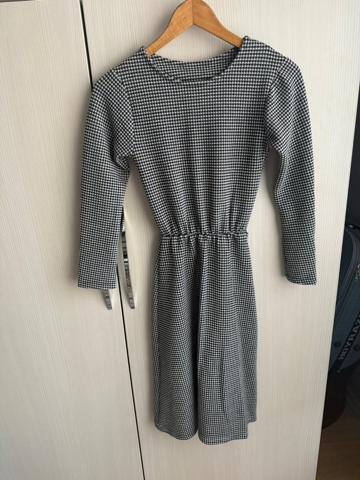 Uzun kollu, yuvarlak yaka ve kemerli beliyle kareli gri midi elbise. Yumuşak sentetik kumaştan, sokak stiline uygun.
