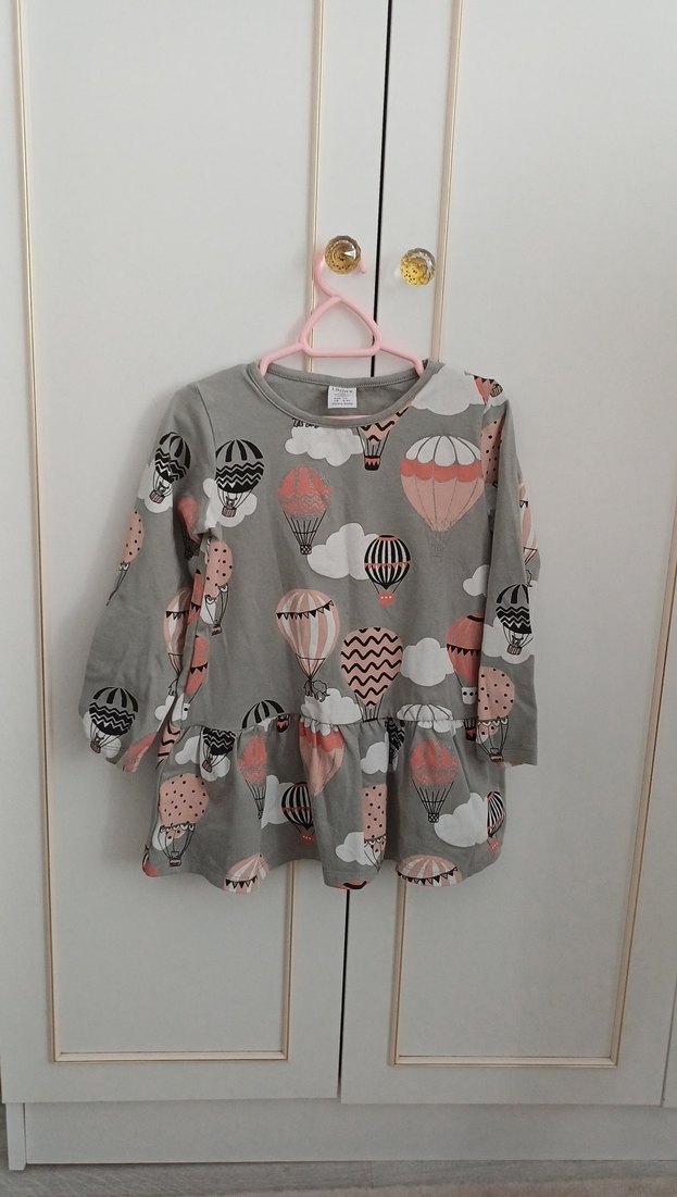 Pamuk kumaştan, bol kesim, uzun kollu ve bisiklet yaka kız çocuk elbise. Balon desenli ve etek kısmında fırfır detaylı, günlük kullanıma uygun şık model.