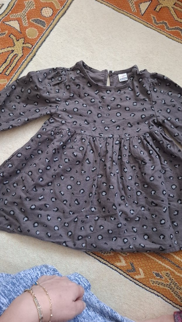Uzun kollu, yuvarlak yakalı ve baskılı fırfırlı gri sentetik kumaştan yapılmış bol kesim kız çocuk elbisesi. Trendy ve rahat bir modeldir.