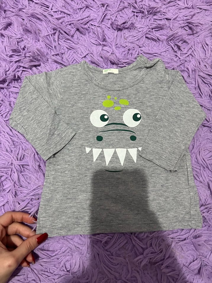 Gri renkli, uzun kollu kız çocuk tişörtü, yumuşak örme kumaştan, bol kesim ve baskılı canavar yüzü detayına sahip.