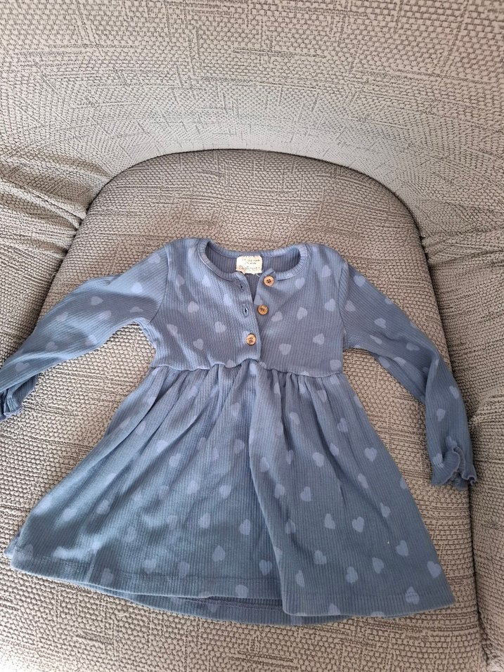 Pamuklu kumaştan yapılmış, düğmeli, uzun kollu ve yuvarlak yaka gri kız elbisesi. Rahat kesim ve hafif kalp desenleri bulunur.