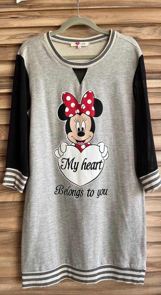 Pamuklu, uzun kollu gri Minnie Mouse baskılı, kalp içinde "My heart belongs to you" yazılı, rahat kesim ve örgü detaylı.