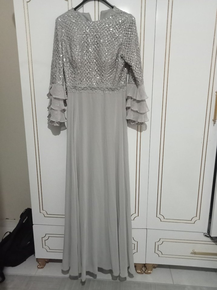 Uzun Kollu Gri Nakışlı Abiye Elbise