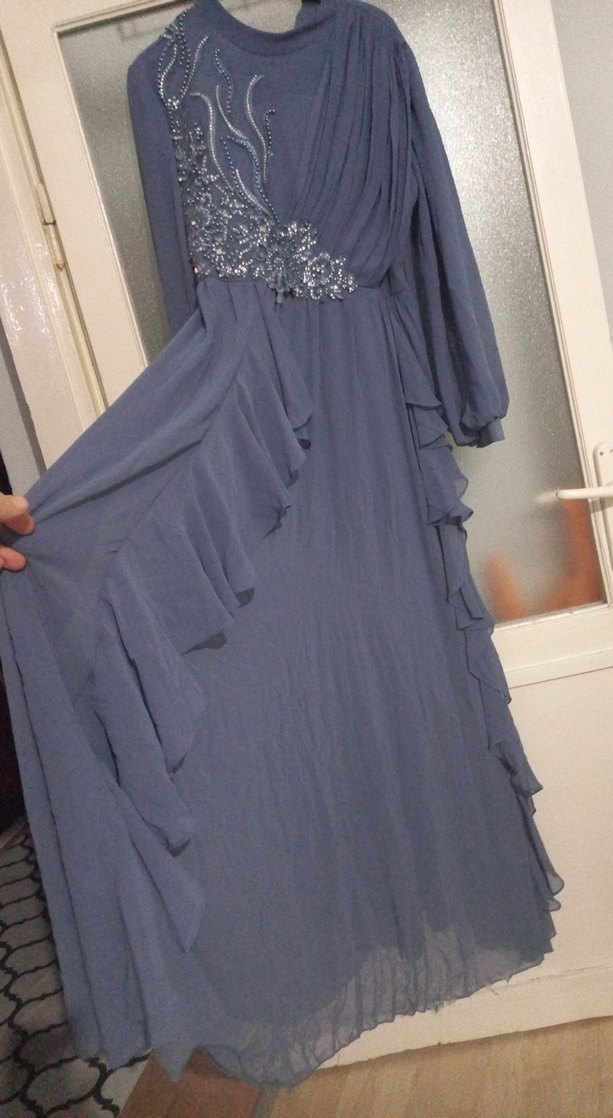Bu uzun gri elbise, nakışlı detaylara ve drapeli kumaşa sahip bol kesimdir. Uzun kollu ve V yakalıdır, düğünler için uygundur. alt kısımda ip çekmeleri var