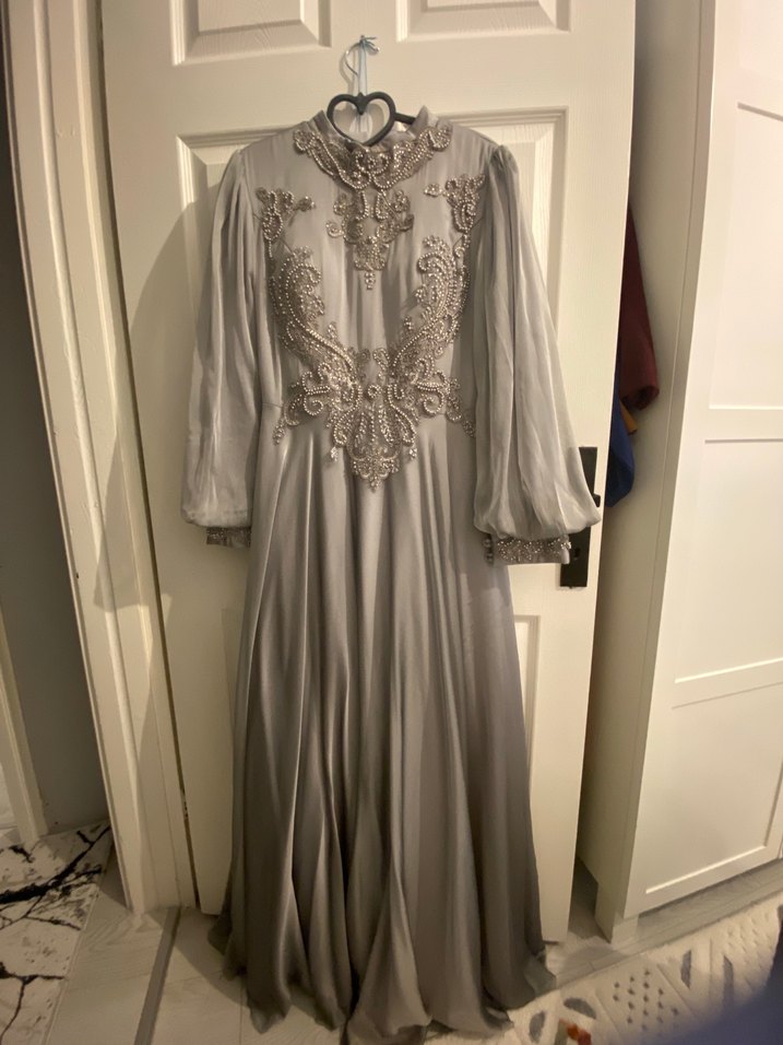 Yüksek yakalı, uzun kollu gri abiye elbise, nakış detayları ve bol kesimiyle düğünlere uygun şık tasarım. 2 kez kullanıldı temiz ve kaliteli herhangi bir defosu yok güncel sıfır fiyatı 4-5 bin arası değişiyor , 40-42-44 beden rahatlıkla olur kolları volanlı olduğu ve A kesim olduğu için kiloyu çok güzel saklıyor 2 beden daha ince gösteriyor