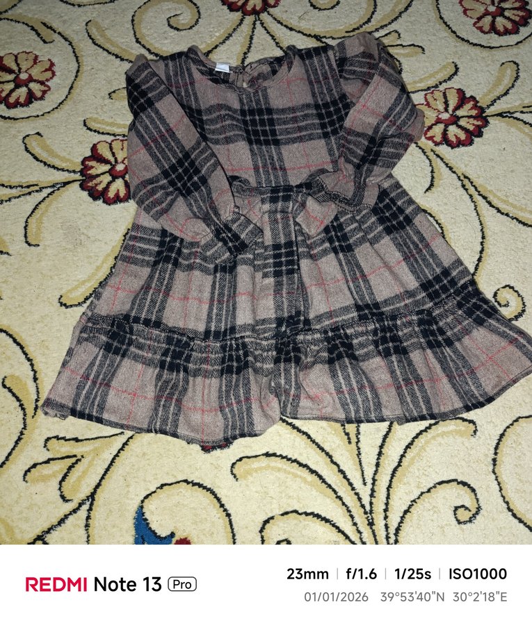 Gri renkte, uzun kollu, nakışlı ve fırfırlı detaylı, bol kesim bohem tarzda kız elbisesi.