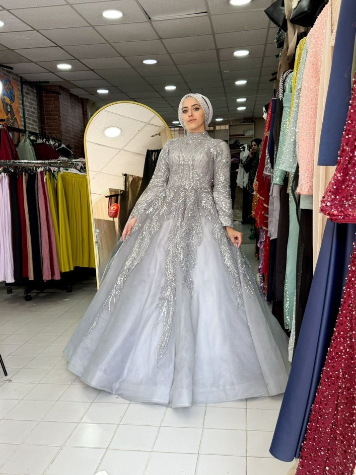 Uzun kollu, yüksek yakalı ve drapeli tasarıma sahip bu gri tesettür abiye, zarif nakış detaylarıyla süslenmiştir. Gösterişli ama mütevazı bir stil sunar.