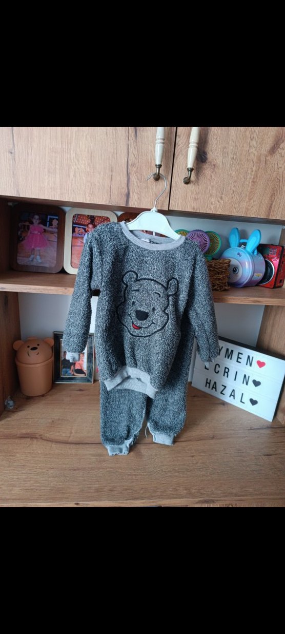 Uzun kollu, yuvarlak yaka gri bebek takımı. Yumuşak ve sıcak kumaştan, örgü dokulu ve baskılı ayı deseniyle rahat kullanım sağlar.