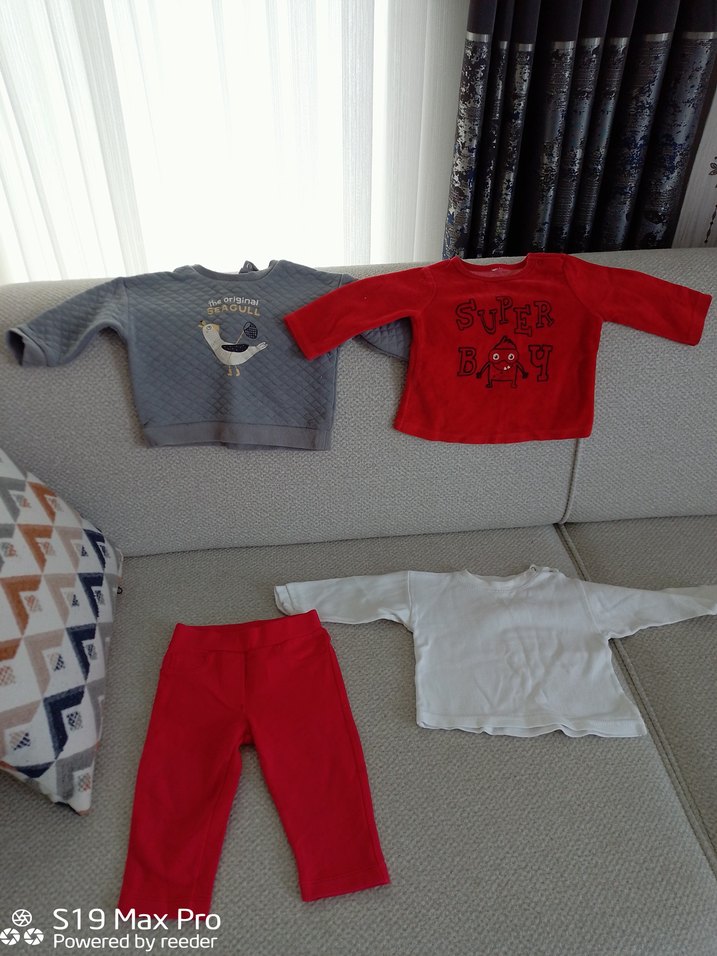 Gri ve kırmızı renklerde, uzun kollu, örme kumaştan iki üst ve bir pantolondan oluşan bebek takımı. Üstlerde yuvarlak yaka ve sade desenler bulunur.Hepsinin fiyatı.