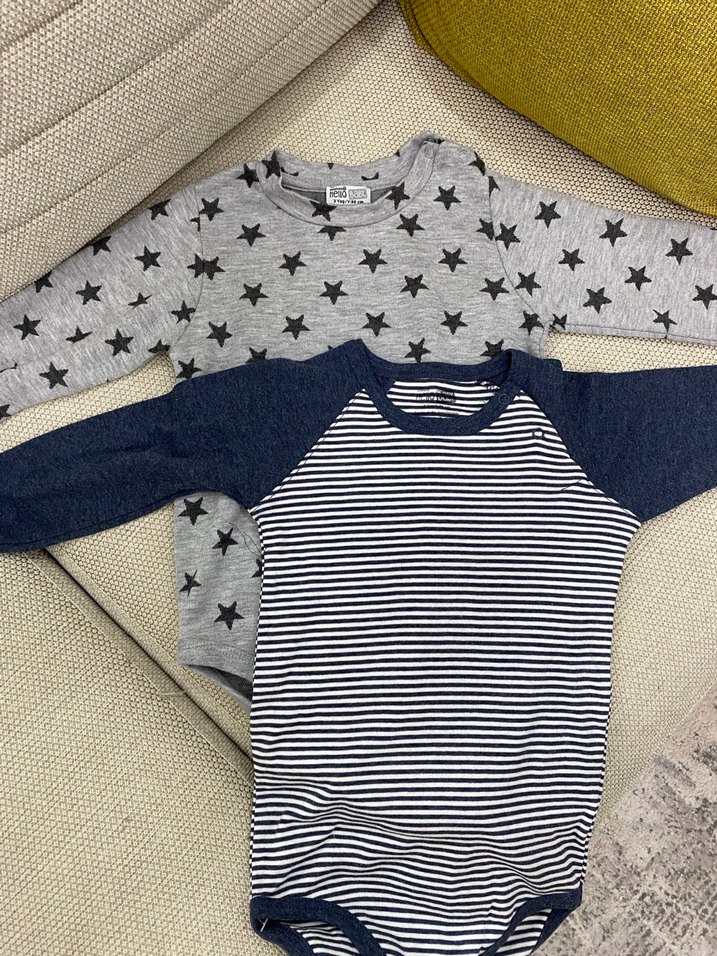 Pamuklu, uzun kollu, gri örme erkek bebek body. Bisiklet yaka ve rahat kesimle günlük kullanıma uygun.