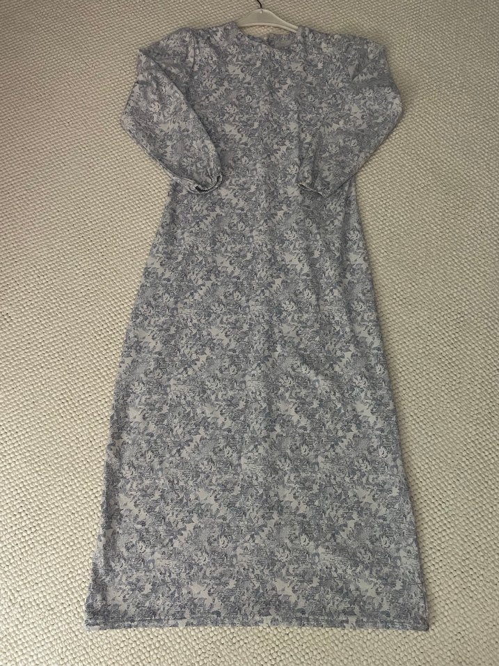 Uzun kollu, kayık yaka gri elbise, dökümlü ve rahat kesimlidir. Yumuşak sentetik kumaştan, günlük kullanıma uygundur.