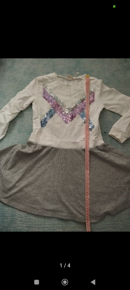 Uzun kollu, V yakalı, bol kesim gri kız elbisesi. Yumuşak sentetik kumaş üzerinde payetli baskılar ve bohem tarzı detaylar içerir. ✨minik leke var